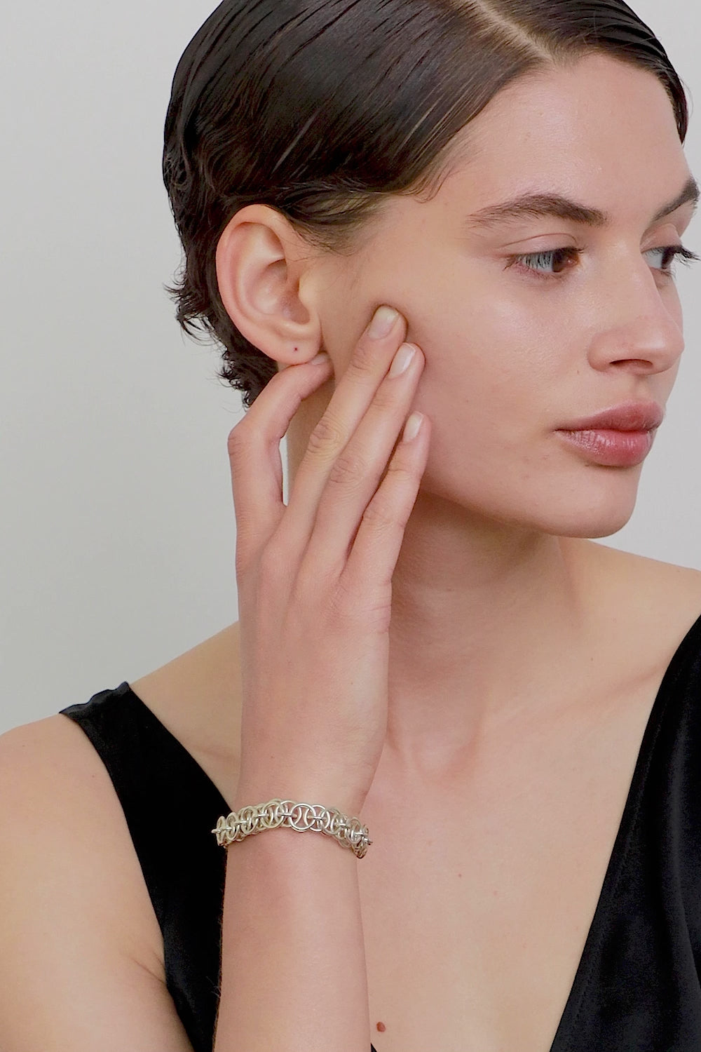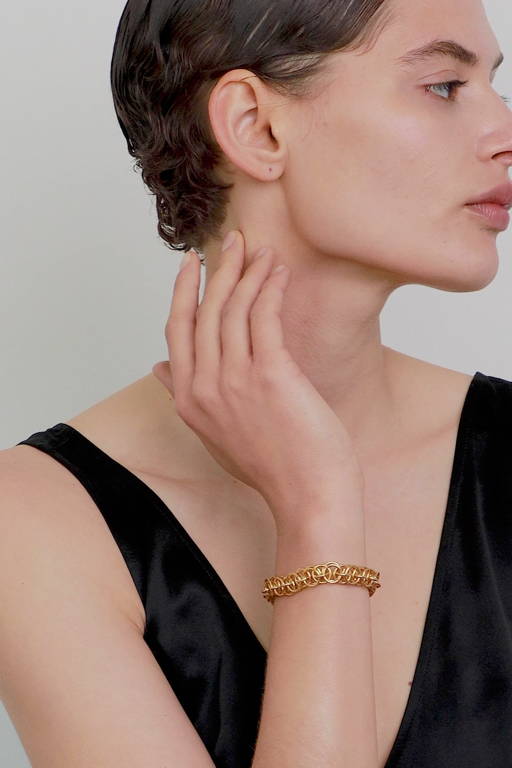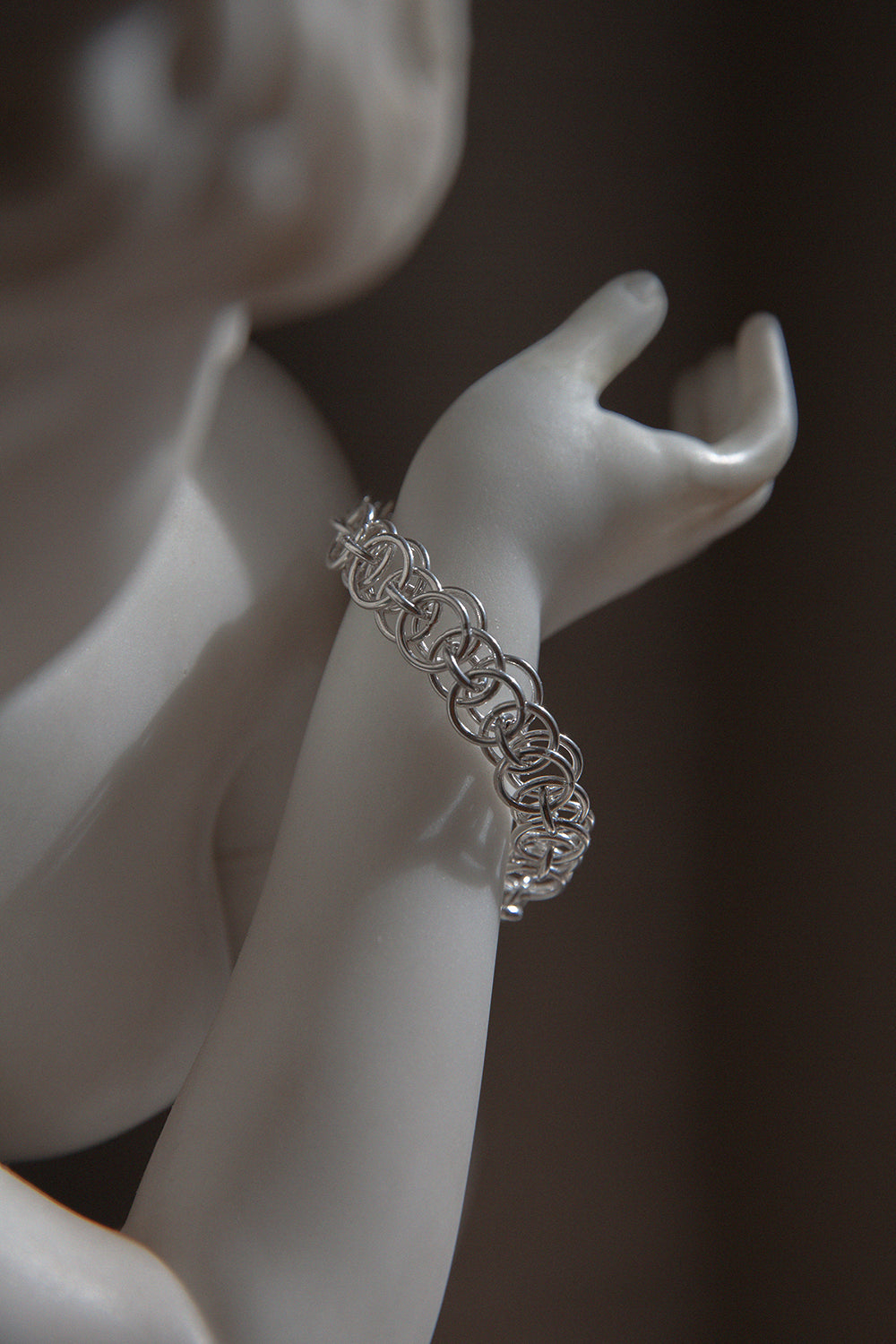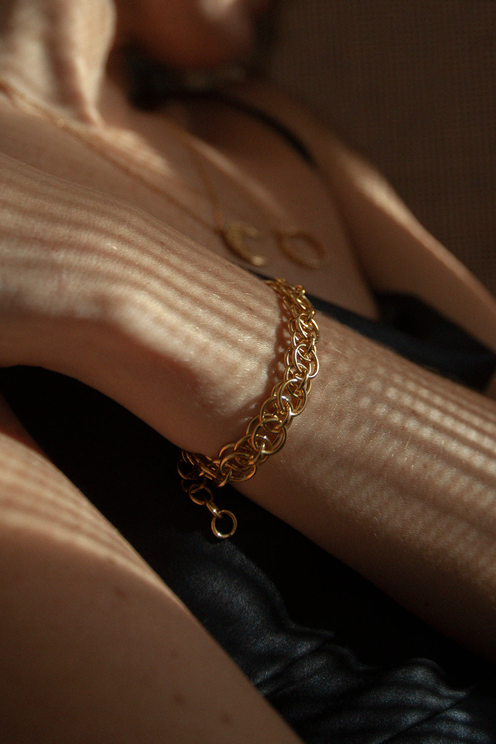 Model pochodzi z kolekcji WIĘZI inspirowanej chęcią tworzenia jednoczących emocji. Istotę kolekcji oddają zastosowane w niej materiały i tradycyjne techniki rzemieślnicze: ażurowe struktury i łańcuchy wyplecione ręcznie w naszej pracowni z setek małych ogniw. WIĘZI to biżuteria dla niej i dla niego; zaprojektowana z myślą o połączeniach, dzięki którym może powstać coś pełnego i pięknego.