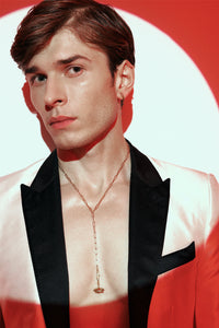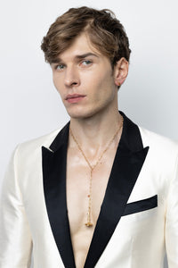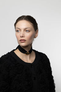 Model pochodzi z kolekcji PROFONDO ROSSO, inspirowanej urodą róży, którą rozkładamy na czynniki pierwsze – gałązki, płatki, ciernie i kwiaty, tworząc na ich podstawie unikalne formy biżuteryjne i modne apaszki.