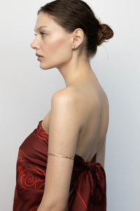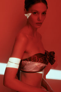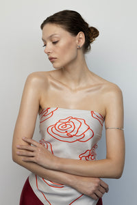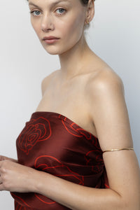 Model pochodzi z kolekcji PROFONDO ROSSO, inspirowanej urodą róży, którą rozkładamy na czynniki pierwsze – gałązki, płatki, ciernie i kwiaty, tworząc na ich podstawie unikalne formy biżuteryjne i modne apaszki.