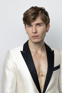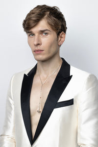 Model pochodzi z kolekcji PROFONDO ROSSO, inspirowanej urodą róży, którą rozkładamy na czynniki pierwsze – gałązki, płatki, ciernie i kwiaty, tworząc na ich podstawie unikalne formy biżuteryjne i modne apaszki.