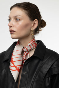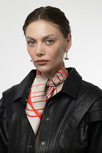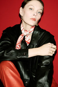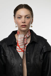 Model pochodzi z kolekcji PROFONDO ROSSO, inspirowanej urodą róży, którą rozkładamy na czynniki pierwsze – gałązki, płatki, ciernie i kwiaty, tworząc na ich podstawie unikalne formy biżuteryjne i modne apaszki.