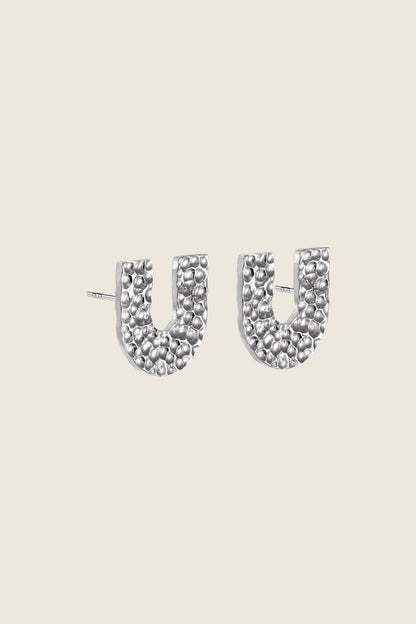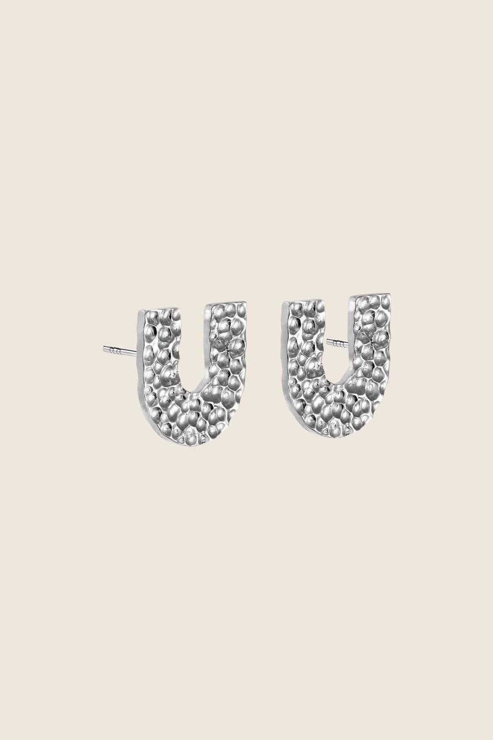 Kolczyki na sztyfcie w kształcie litery U z młotkowaną fakturą. Wymiary kolczyków: 18 x 18 mm.