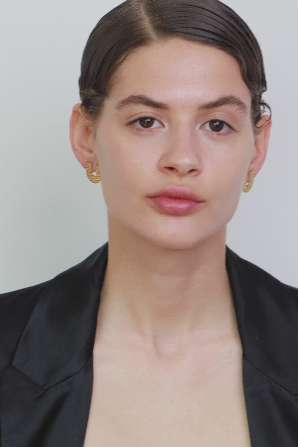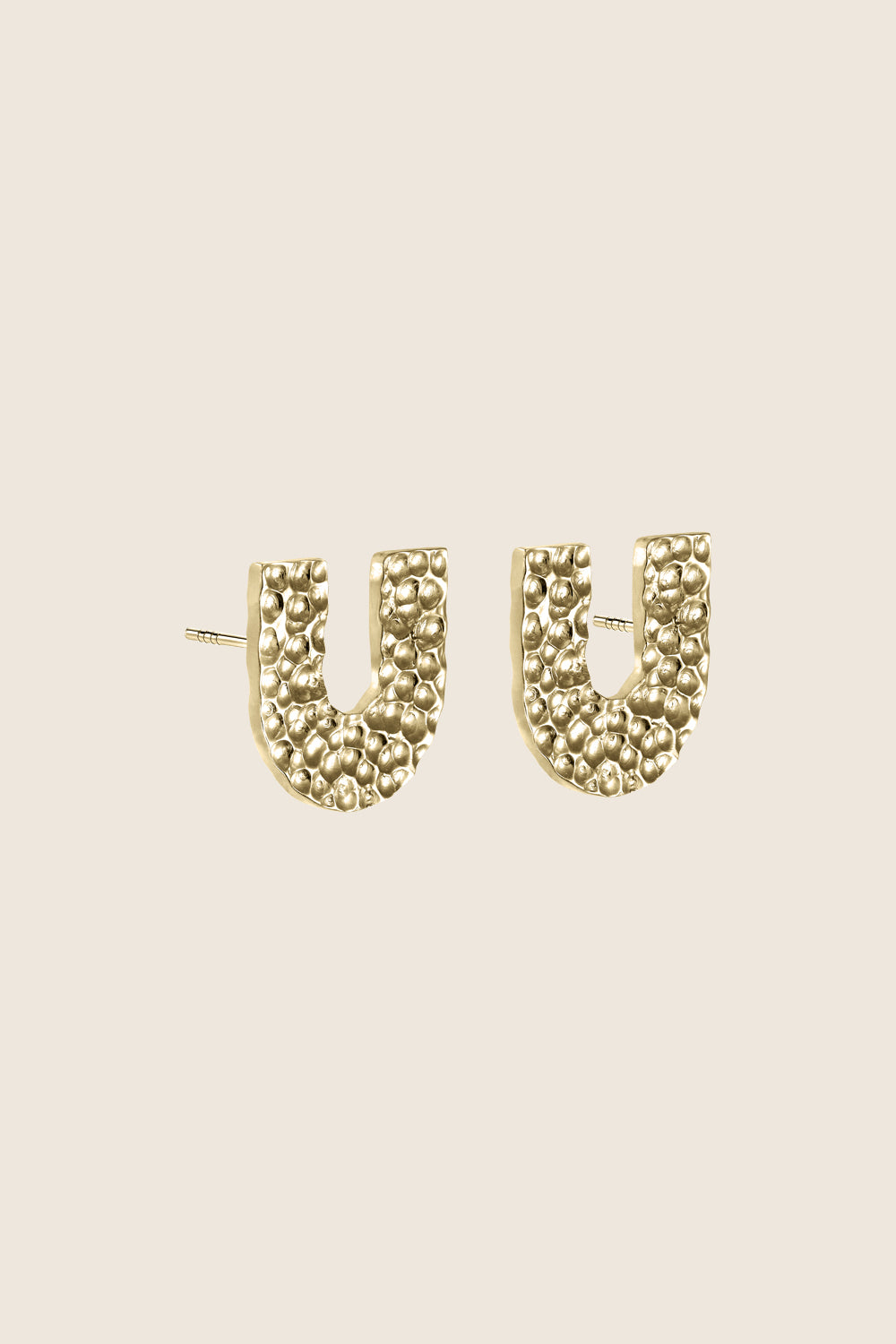 Kolczyki na sztyfcie w kształcie litery U z młotkowaną fakturą. Wymiary kolczyków: 18 x 18 mm.