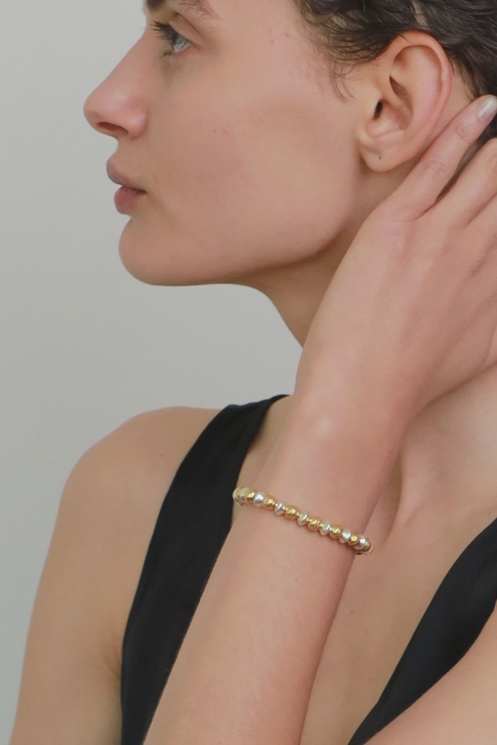 Po co wybierać między złotem a srebrem, skoro można nosić oba? Bransoletka PARS to wyjątkowy dodatek, który powstał z połączenia naprzemiennie ułożonych srebrnych koralików – gładkich dysków i kulistych sfer o nieregularnej powierzchni. W całości wykonana ze srebra próby 925; okrągłe koraliki złocone 24-karatowym złotem.