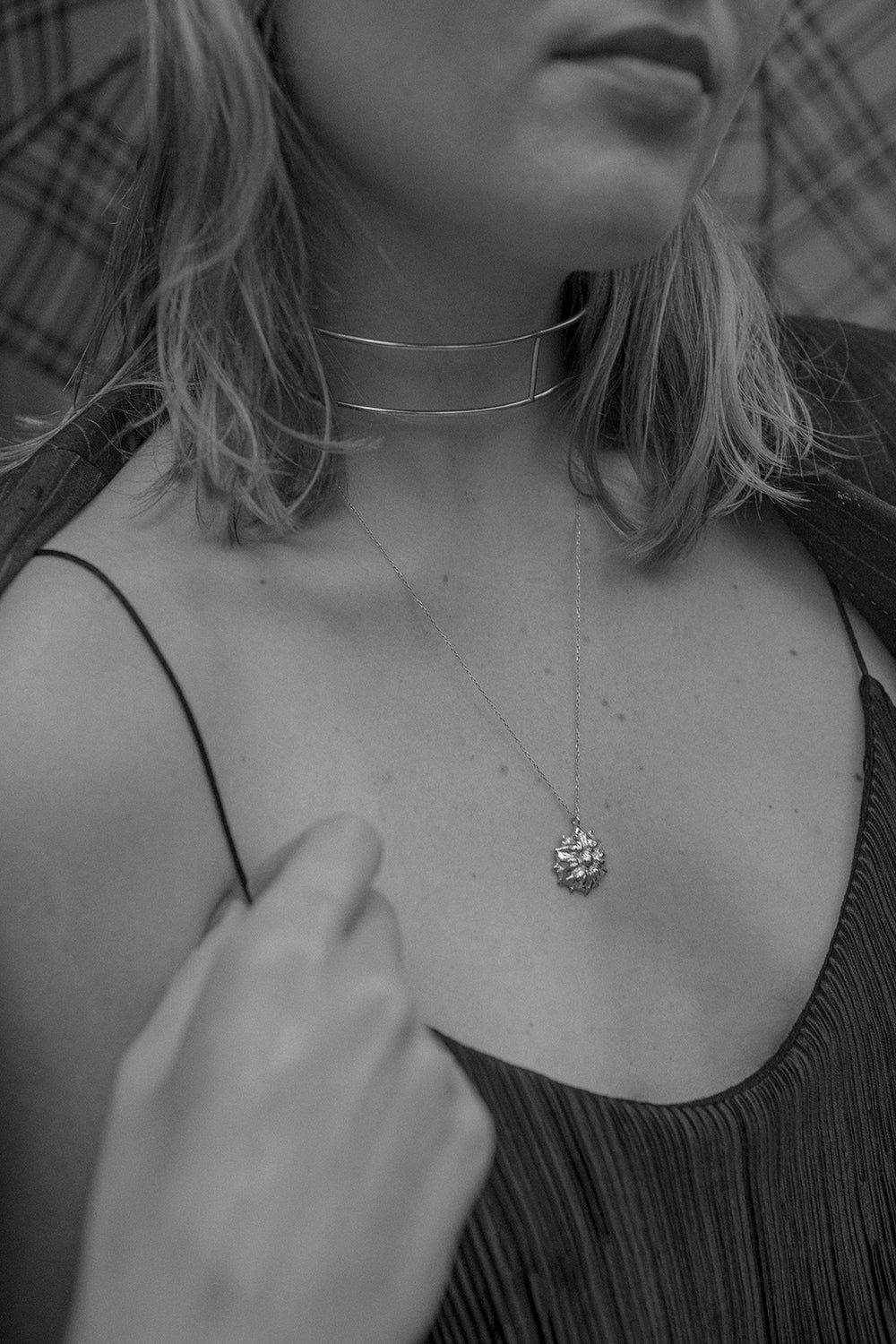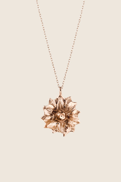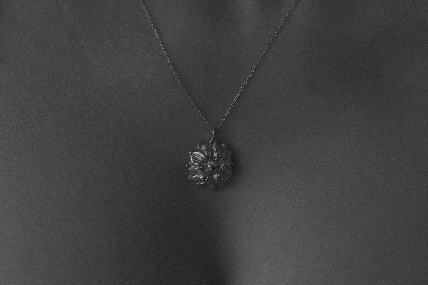 Dekoracyjny wisiorek-kwiat zawieszony na srebrnym łańcuszku. Przykuwający wzrok model, który powstał z inspiracji duchem vintage. Intrygujący miks bogato fakturowanej zawieszki i subtelnego łańcuszka sprawia, że tak projektowane wzornictwo zyskuje absolutnie współczesny wyraz. Świetny wybór dla osób kochających niebanalne, florystyczne motywy oraz idealny prezent do wręczania „z” lub „zamiast” kwiatów. Średnica zawieszki: 20 mm. Długość łańcuszka: 50 cm..