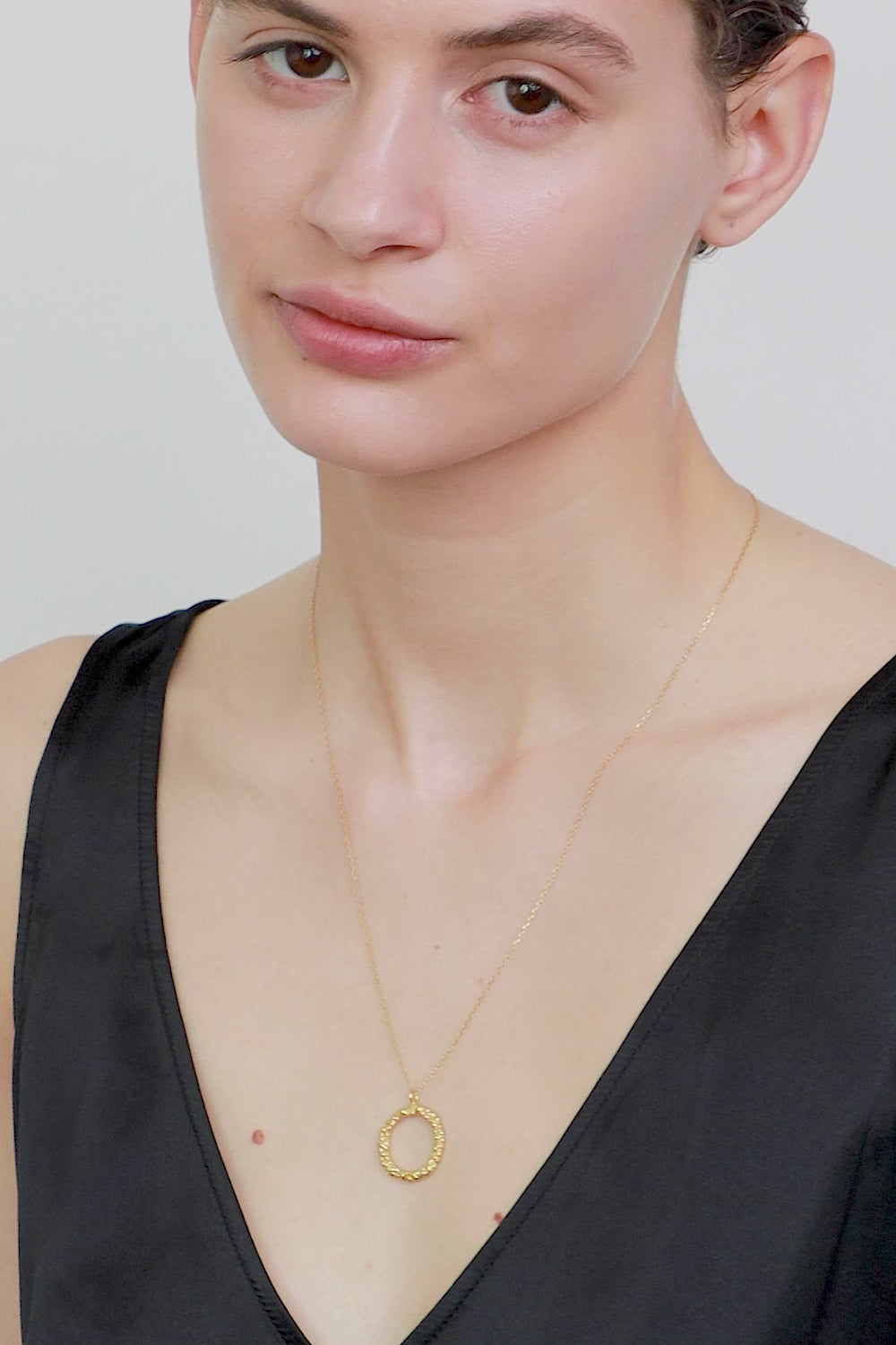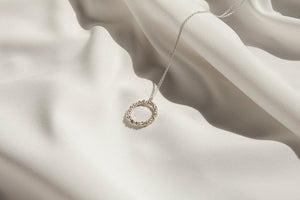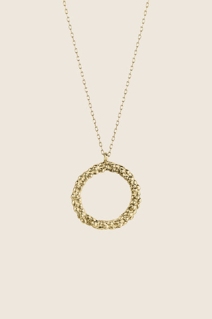 Wisiorek-koło – symbol doskonałości – o bogatej strukturze nakrapianego srebra. Granulowana, nieregularna faktura odzwierciedla wygląd księżyca w pełni. Niebanalny, inspirowany kosmosem model, który z powodzeniem założysz jako codzienny talizman lub wieczorowy, elegancki dodatek. Wisiorek zawieszony na złotym łańcuszku o długości 50 cm.
