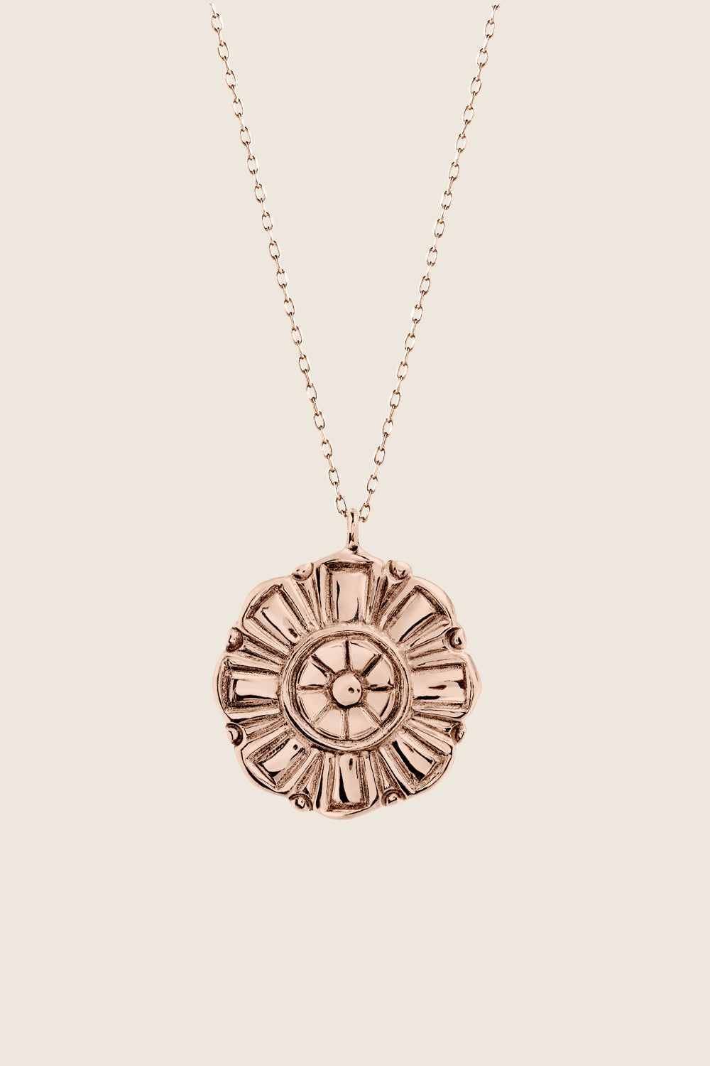 Duży, okrągły wisiorek w kształcie kwiatu zawieszony na złotym łańcuszku o dł. 50 cm. Wyjątkowo dekoracyjny. Idealna ozdoba dekoltu zaprojektowana w duchu vintage. Dzięki uproszczonemu rzeźbieniu zawieszki oraz subtelnej formie łańcuszka, naszyjnik zyskuje niezwykle elegancki charakter. Dla osób kochających mocne, florystyczne motywy oraz wyróżniające się jakością i formą wzornictwo. Średnica zawieszki: 27 mm.