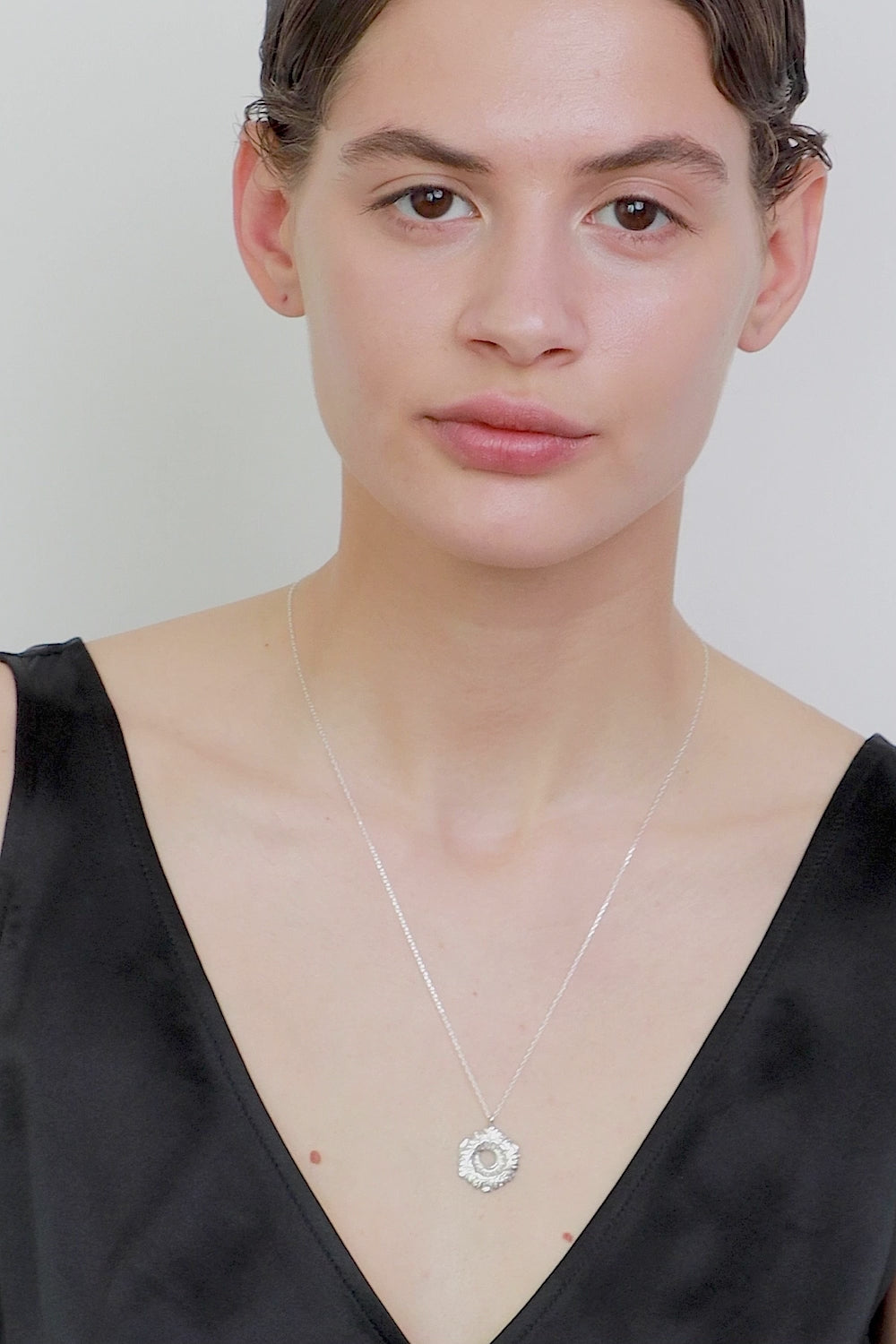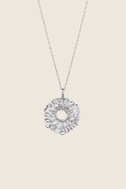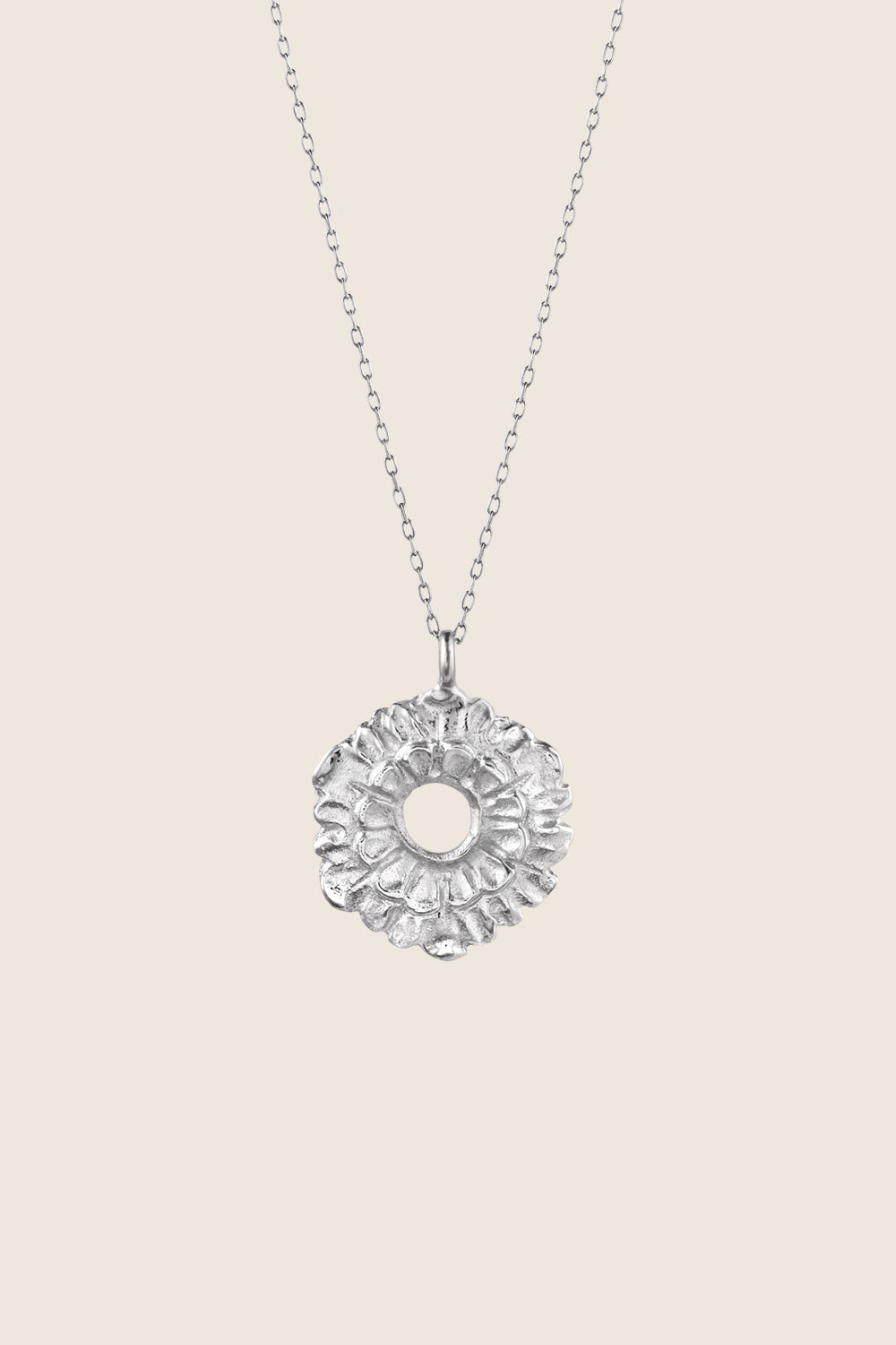 Okrągły wisiorek-kwiat zawieszony na łańcuszku o dł. 50 cm. Dekoracyjny, florystyczny motyw inspirowany duchem vintage. Wyjątkowo elegancki. Noś go z letnimi sukienkami lub lekko rozpięta koszulą. Naszyjnik doskonale sprawdzi się jako podarunek “z” lub “zamiast” kwiatów. Średnica zawieszki: 20 mm.
