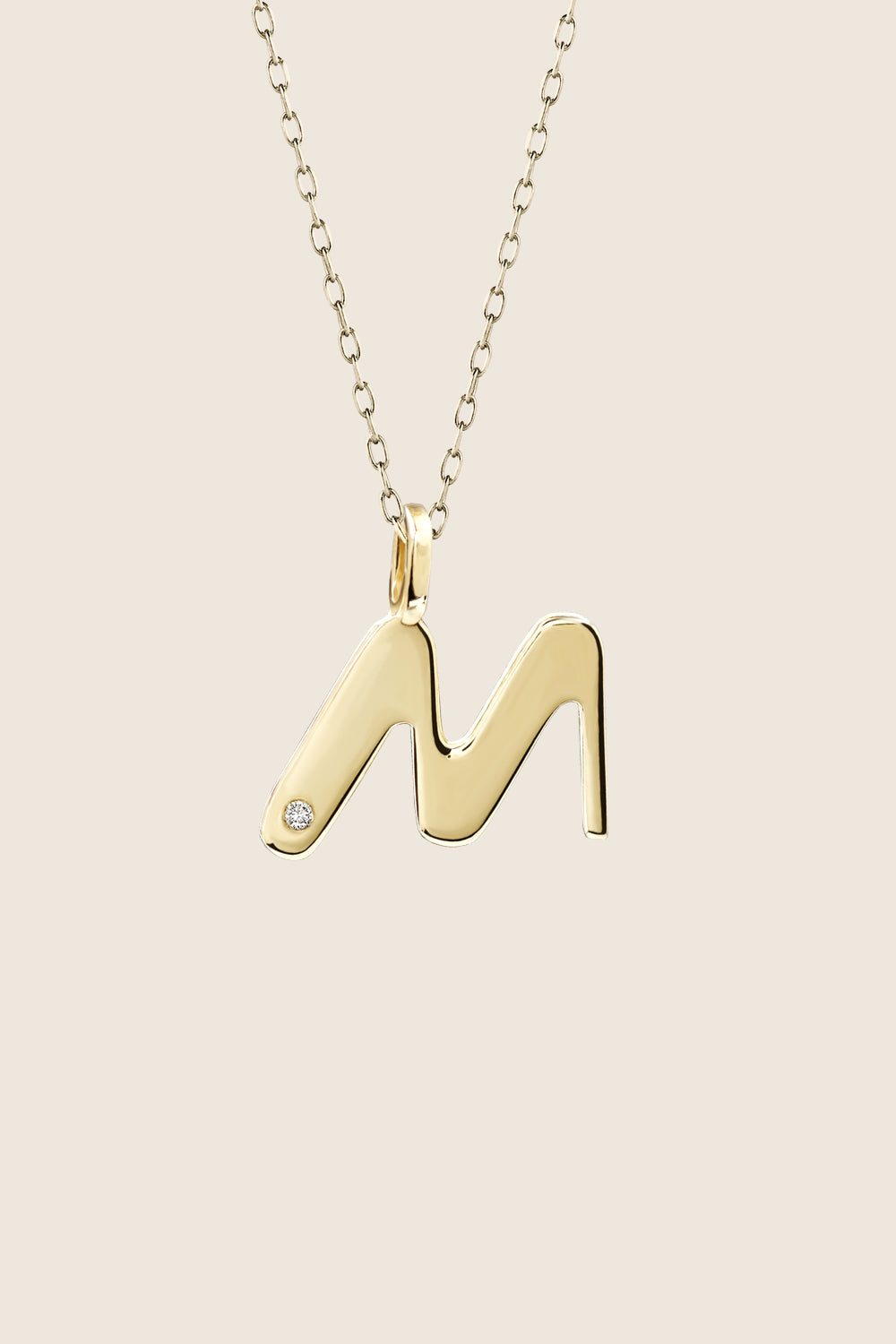 Subtelny wisiorek na łańcuszku w kształcie litery M, inkrustowany naturalnym brylantem o masie 0,007 ct (1,2 mm). Naszyjnik z literą to świetny sposób na uhonorowanie bliskiej osoby. Dzięki dodatkowi diamentu prezent zyskuje szczególny charakter, elegancki kształt i proporcja sprawiają zaś, że naszyjnik nigdy nie wyjdzie z mody. Delikatny i klasyczny inicjał to wyjątkowa pamiątka, która wspaniale podkreśla osobisty urok i moc każdego imienia. Wysokość zawieszki wraz z okiem: ok. 15 mm. Długość łańcuszka: 50 cm