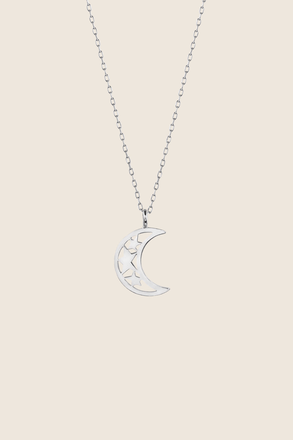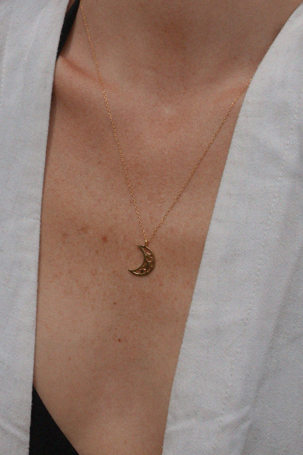 Wisiorek w kształcie księżyca zawieszony na łańcuszku o długości 50 cm. Rozmiar wisiorka 17 x 14 mm.