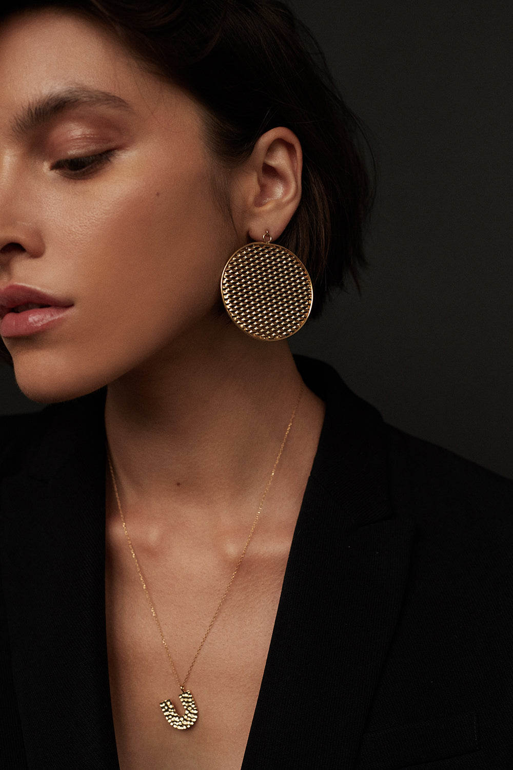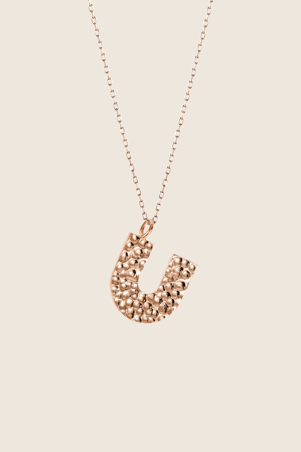 Naszyjnik w kształcie nawiązującym zarówno do litery U, jak i podkowy – symbolu dostatku i szczęścia. Dekoracyjnie młotkowana faktura oraz pieczołowicie dobrana proporcja sprawiają, że całość zyskuje ponadczasowy urok. Doskonały prezent dla każdego, komu życzymy powodzenia w pracy i podejmowanych działaniach. Wymiary zawieszki: 18 x 18 mm. Długość łańcuszka: 50 cm.