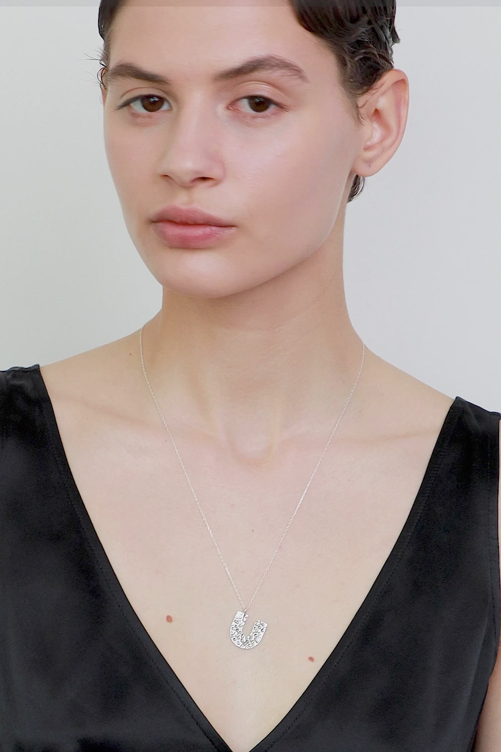 Naszyjnik w kształcie nawiązującym zarówno do litery U, jak i podkowy – symbolu dostatku i szczęścia. Dekoracyjnie młotkowana faktura oraz pieczołowicie dobrana proporcja sprawiają, że całość zyskuje ponadczasowy urok. Doskonały prezent dla każdego, komu życzymy powodzenia w pracy i podejmowanych działaniach. Wymiary zawieszki: 18 x 18 mm. Długość łańcuszka: 50 cm.