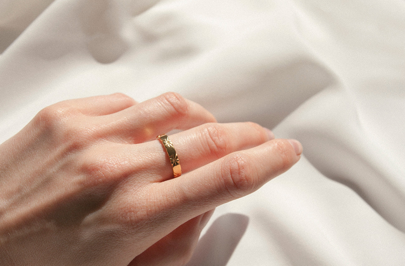 Elegancki pierścionek-obrączka z odciśniętym motywem gwiazdy. Wyjątkowy design pierścionka, nadaje mu charakteru i unikalności, czyniąc go doskonałym dodatkiem do każdej stylizacji. Dla miłośniczek i miłośników kosmosu oraz minimalistycznych form zdobniczych. Doskonale łączy się z fakturowanym modelami obrączek, takimi jak DORSA czy CRATER. Wysokość pierścionka: 3 mm.