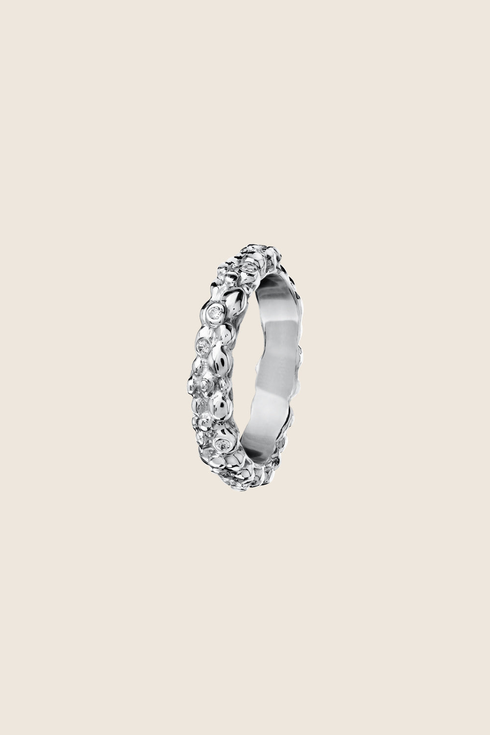 Odważny i piękny. Pierścionek dla tych, którzy myślą o zaręczynach w mniej konwencjonalny sposób. Granulowana faktura nawiązuje do form widocznych na powierzchni księżyca. Dyskretnie inkrustowany w zagłębieniach 11 brylantami o masie 0,007 ct każdy.