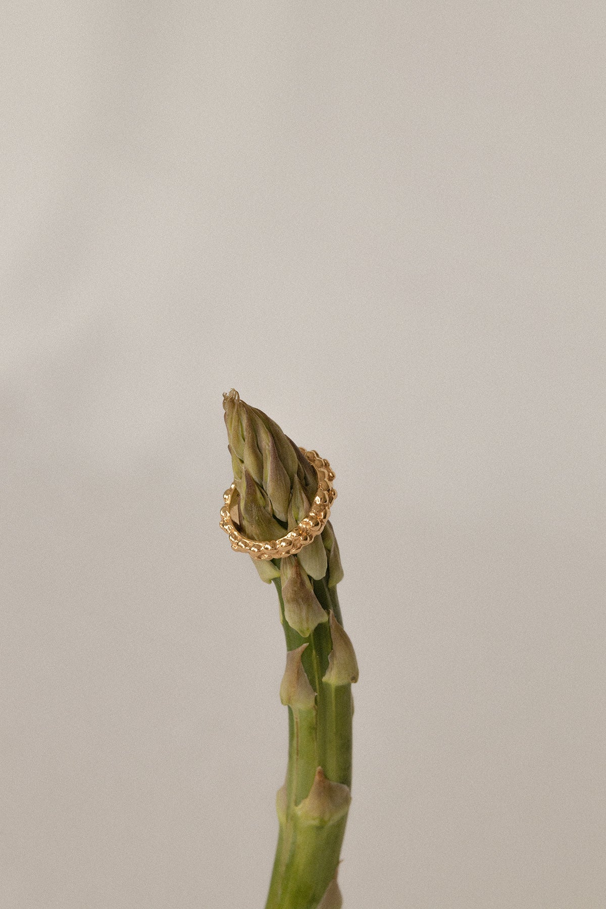 Obrączka o dekoracyjnej, nieregularnej strukturze nakrapianego złota. Granulowana, rozrzeźbiona faktura, inspirowana powierzchnią księżyca, świetnie sprawdzi się w zestawieniu zarówno z organicznymi, jak i minimalistycznymi formami. Ten unikalny design wspaniale łączy elegancję i subtelność, tworząc wyjątkowy dodatek do każdej stylizacji. Możliwa inkrustacja kamieniami szlachetnymi, sprawdź model CRATER ARDA.