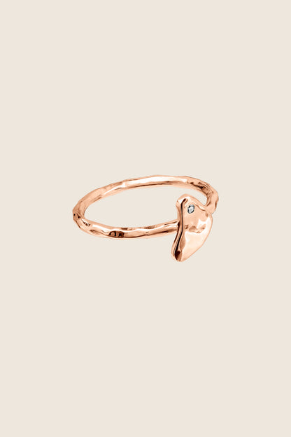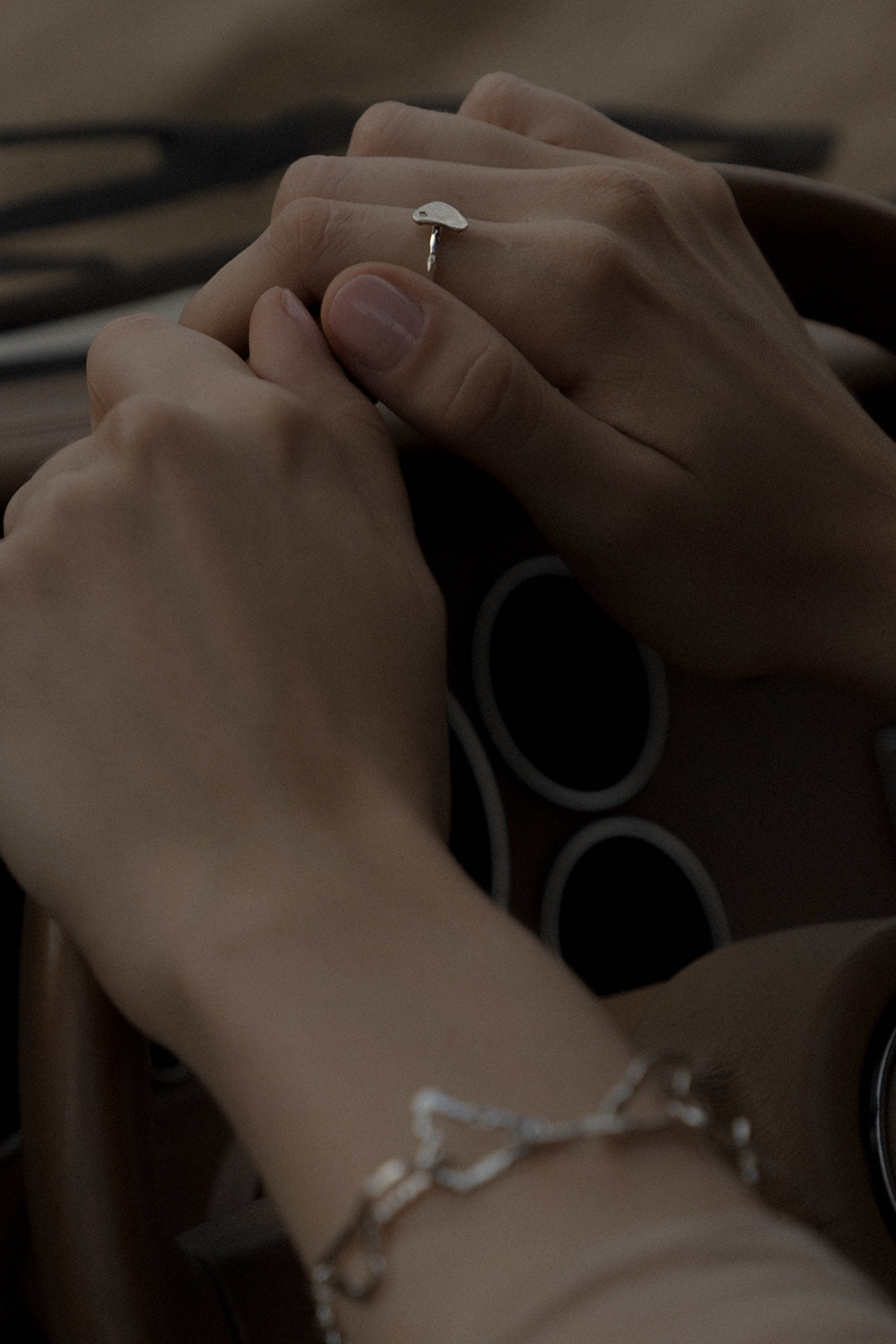 Subtelny pierścionek w formie obrączki z elementem ozdobnym wzorowanym na topografii Monte Solaro, najwyższego punktu na mapie Capri. Inkrustowany brylantem o masie 0,007 ct (1,2 mm). Wymiary elementu ozdobnego: 9 x 6 mm.