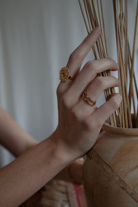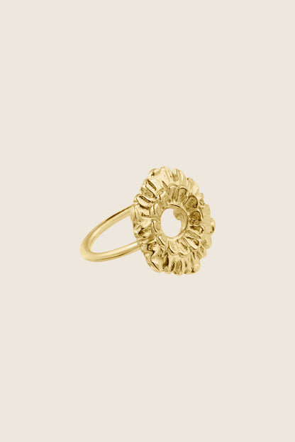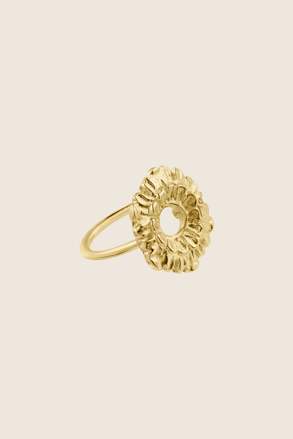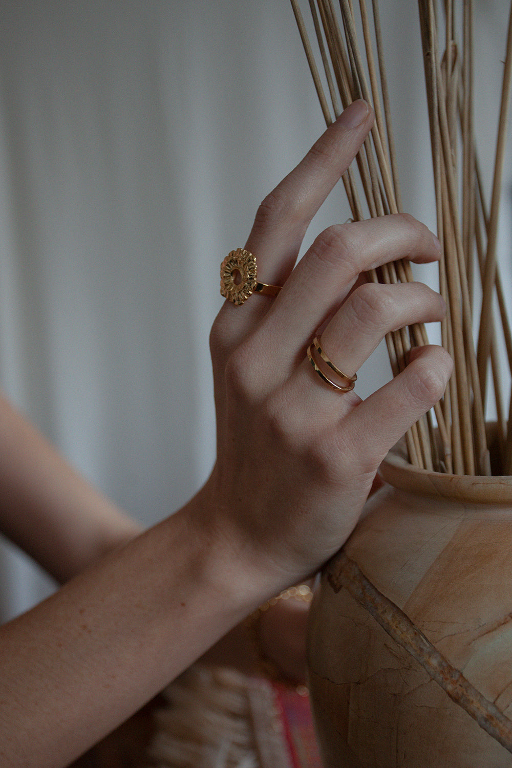 Duży, elegancki pierścionek-kwiat o średnicy 20 mm. Ponadczasowy, florystyczny motyw w nowoczesnym wydaniu. Doskonale wygląda solo, noszony jako dominanta i jedyna ozdoba dłoni. Pasuje również do wszystkich minimalistycznych pierścionków marki, tworząc intrygujący kontrast.