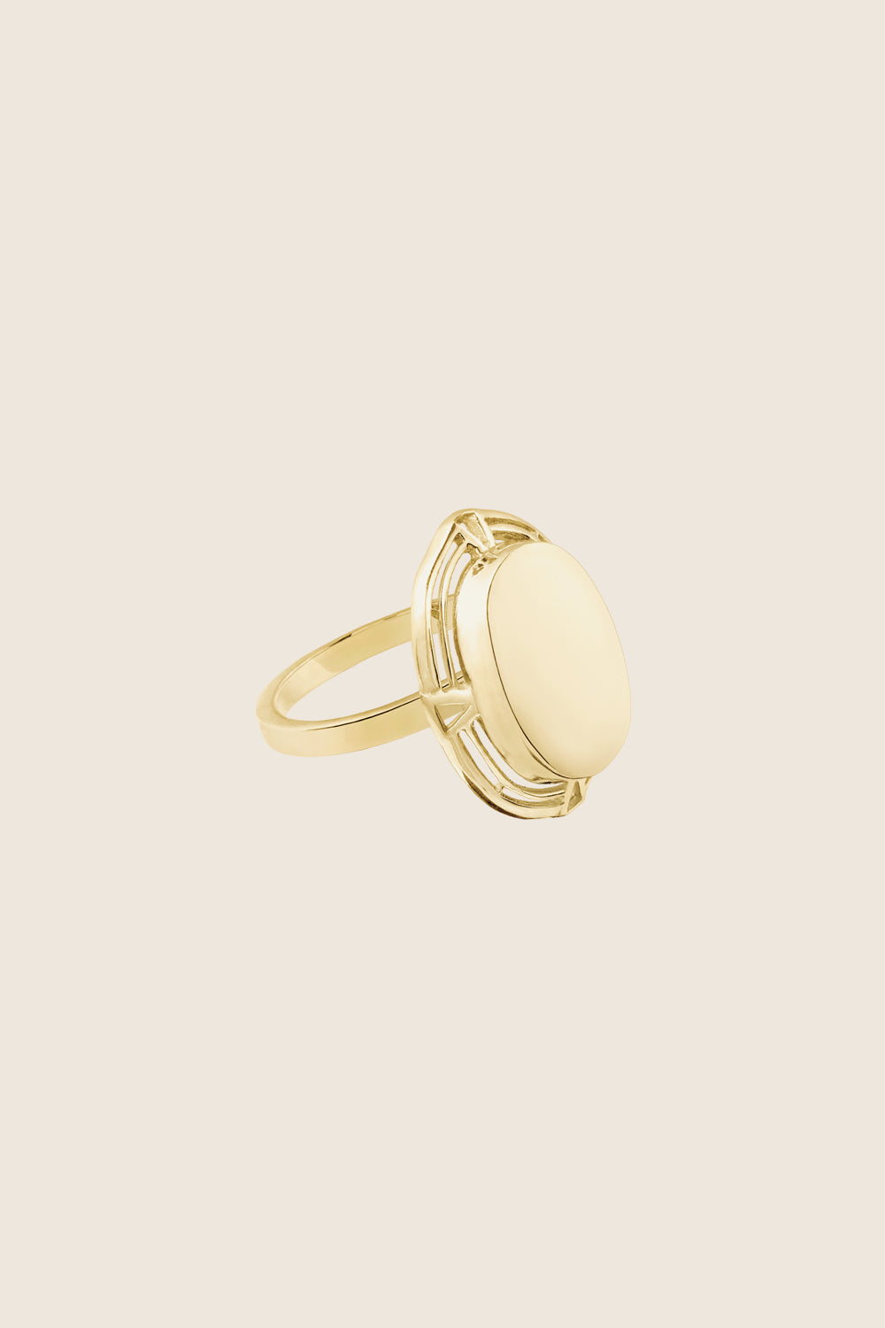 Dekoracyjny, owalny pierścionek-koszyczek zaprojektowany w duchu vintage. Elegancka forma nawiązuje do ponadczasowego uroku biżuterii sprzed lat. Część przednia, polerowana na gładko, nadaje całości minimalistyczny, współczesny charakter. Pierścionek świetnie wygląda zarówno na palcu serdecznym, jak i wskazującym. Możesz go dowolnie łączyć z modelami z kolekcji – polecamy zwłaszcza wszystkie typy obrączek. Wysokość: 20 mm.