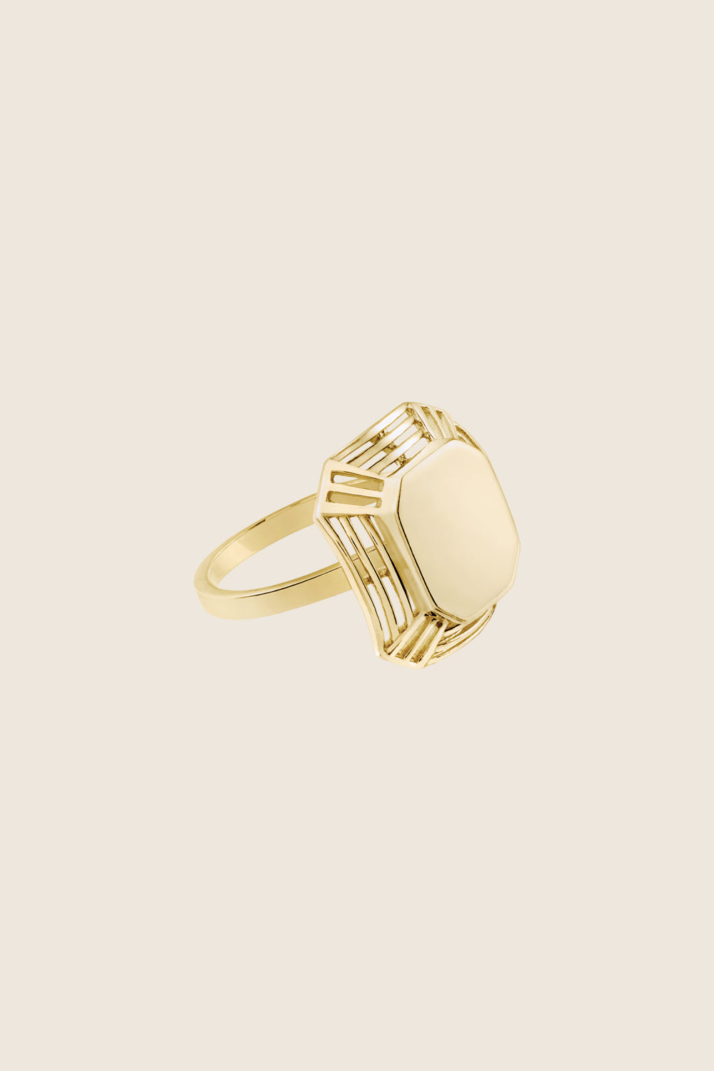 Elegancki pierścionek-koszyczek zaprojektowany w duchu vintage. Idealnie oddaje ponadczasowy urok stylu art deco i biżuterii z dawnych lat. Kwadratowa forma elementu ozdobnego dynamizuje całość, nadając jej współczesny, a nawet futurystyczny charakter. Dla miłośniczek retro-minimalizmu. Część przednia polerowana na gładko. Wymiary: 15 x 15 mm