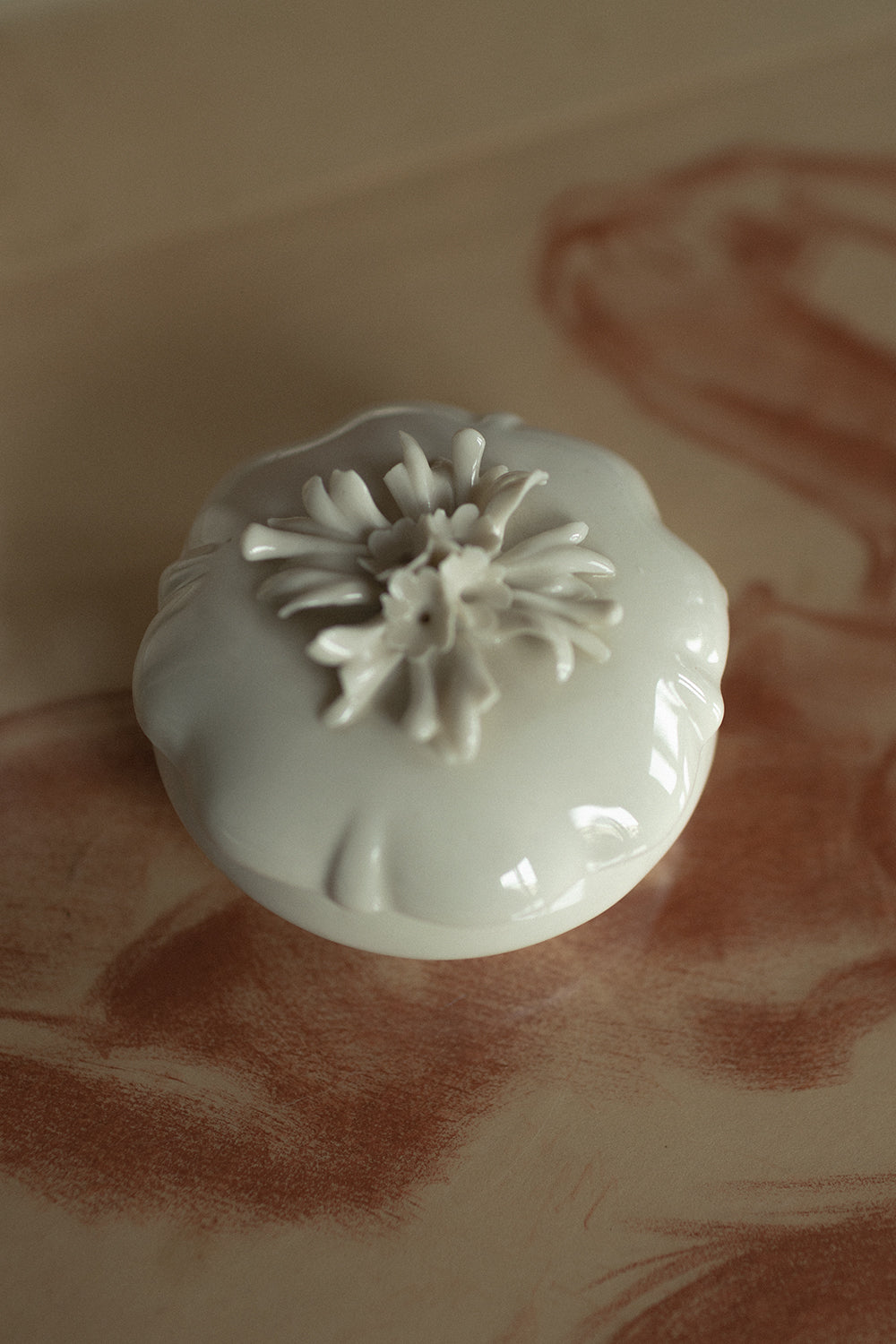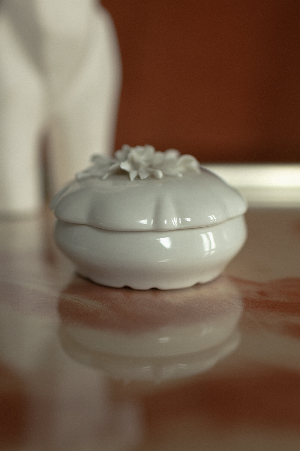 Porcelanowa szkatułka vintage pokryta błyszczącą warstwą szkliwa ceramicznego. Wieczko zdobione oryginalną, kwiatową dekoracją. Szkatułka idealnie sprawdzi się do przechowywania biżuterii lub innych drobiazgów.